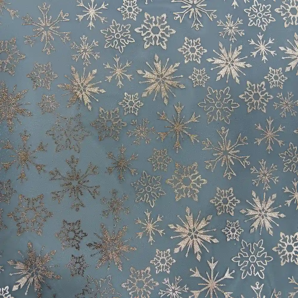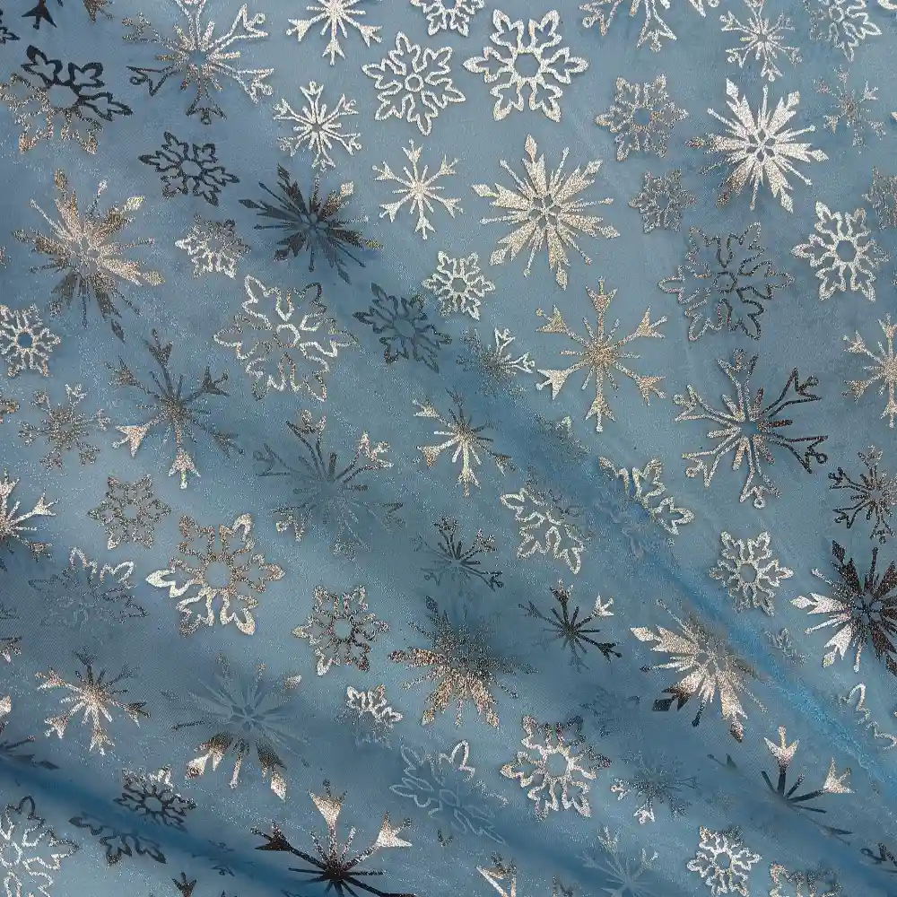 Tela de organza azul estampada copos de nieve
