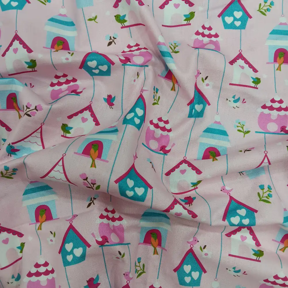 Tela de algodón 100% con estampado infantil de casitas de pájaros. Ideal para ropa, accesorios y decoración infantil.