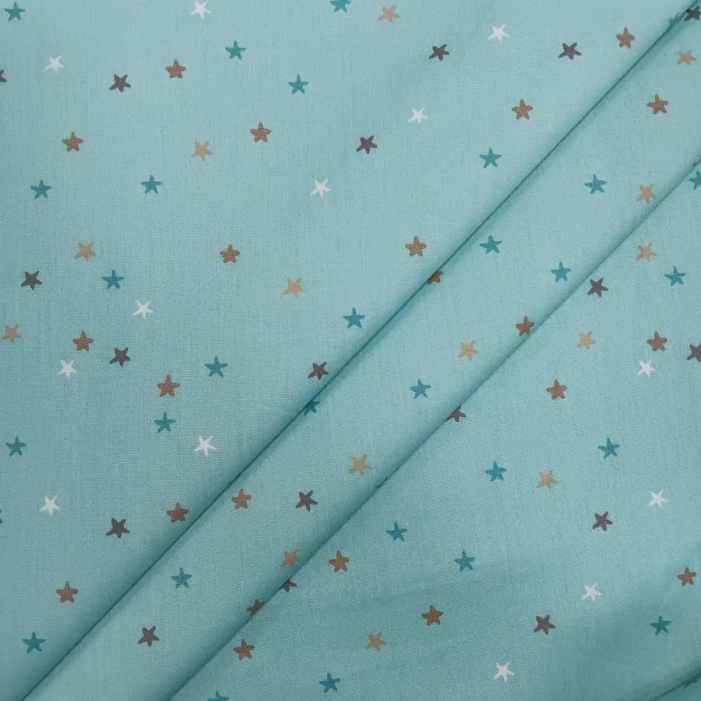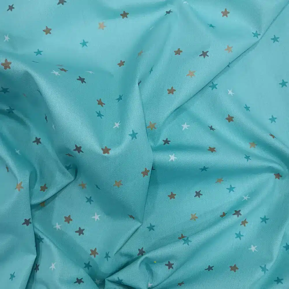Tela de algodón celeste con estrellas estampadas. Ideal para costura creativa, ropa infantil, patchwork, accesorios y proyectos de decoración.