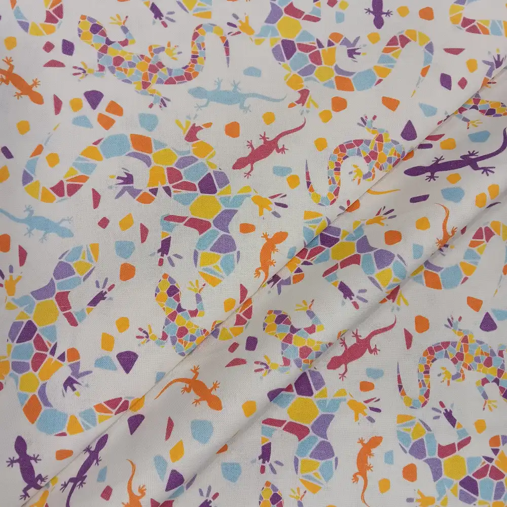 Tela de algodón estampada con salamandras, inspirada en el estilo modernista típico de Gaudí, ideal para confección, infantil y decoración.