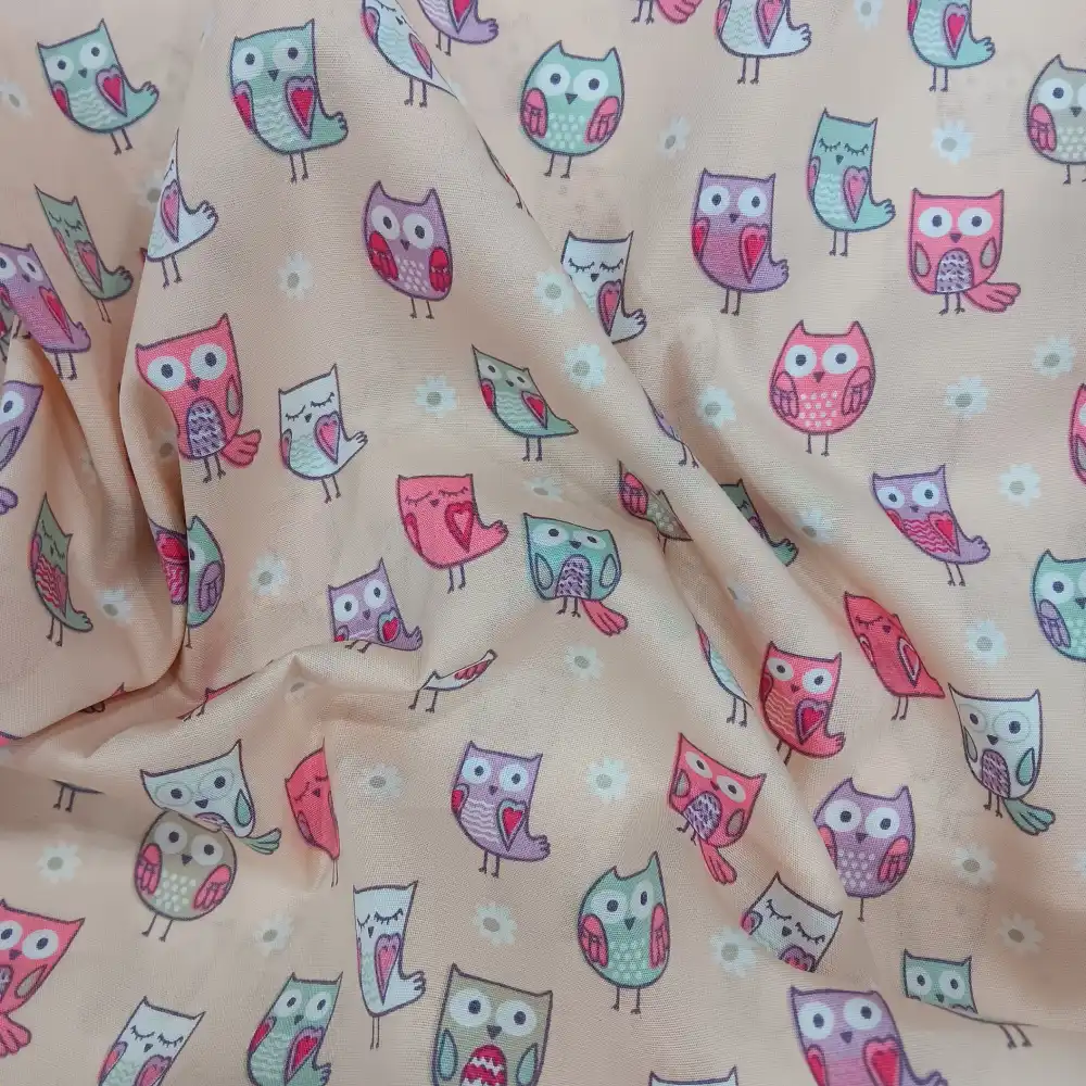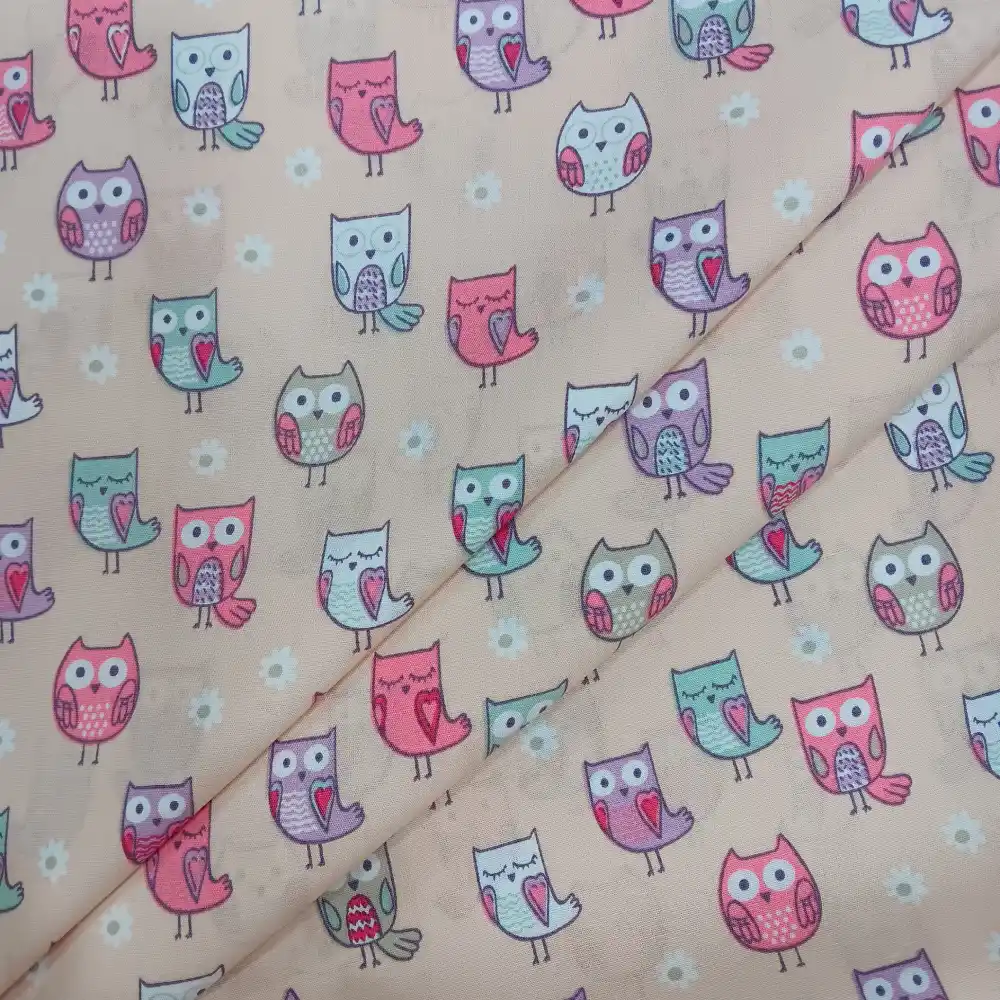 Tela de algodón con estampado de búhos en tonos pastel sobre fondo beige, perfecta para costura infantil, decoración y manualidades.