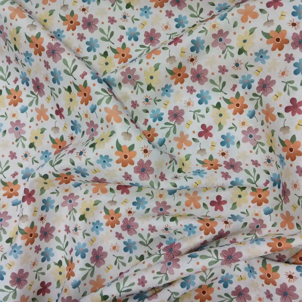 Tela de algodón con estampado floral de flores pequeñas en colores vivos sobre fondo claro, perfecta para costura creativa y patchwork.