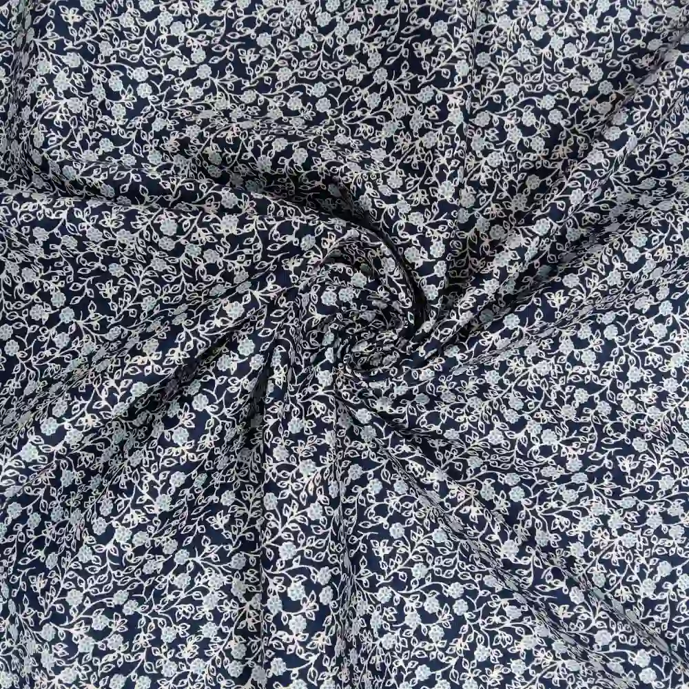 Tela de algodón estampada con flores pequeñas azul marino, suave y natural, ideal para confección, patchwork y decoración artesanal.