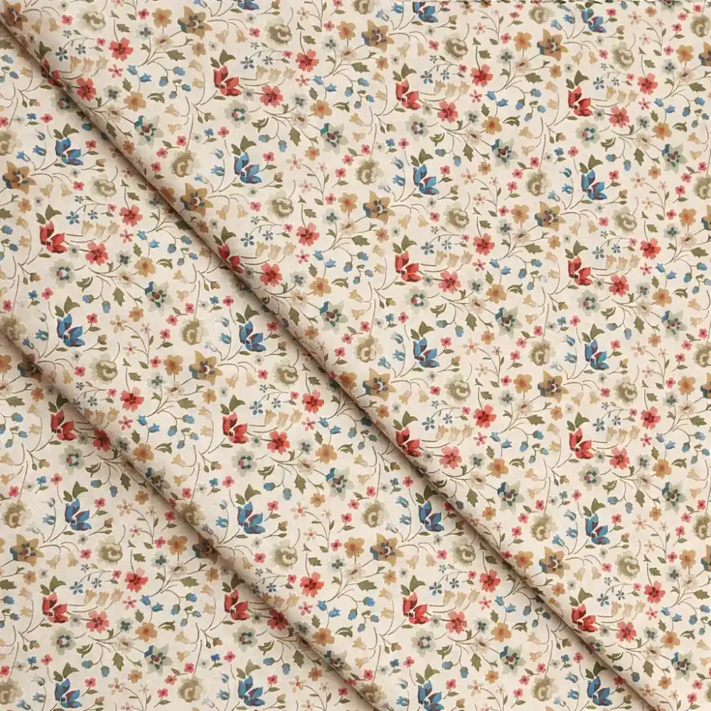 Tela de algodón 100% con flores verdes, azules y teja sobre fondo beige. Ideal para ropa, accesorios y costura creativa.