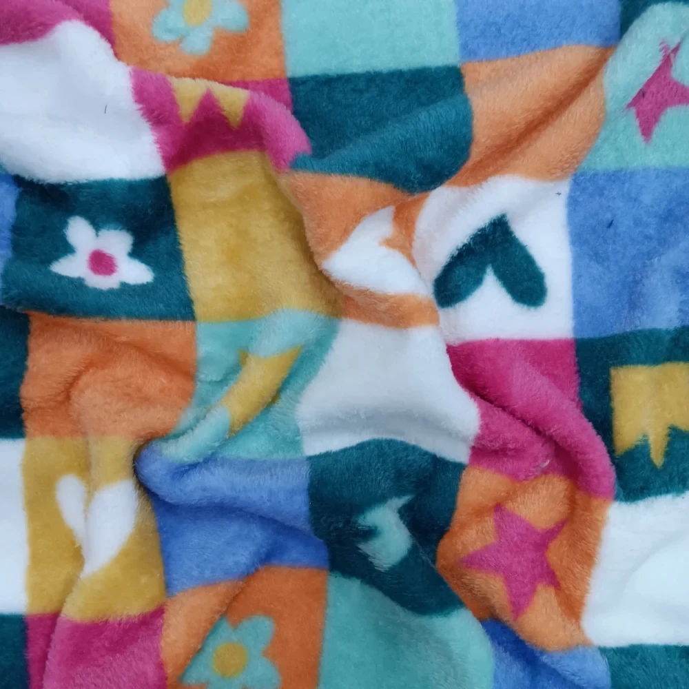 Tela coralina suave con cuadros multicolor decorados con corazones y estrellas. Ideal para mantas, pijamas y proyectos cálidos y divertidos.