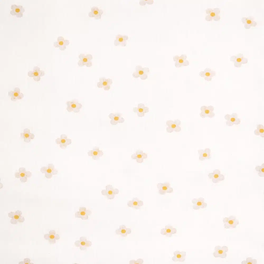 Tela de algodón flores pequeñas beige con centro amarillo. Suave, ligera y perfecta para moda infantil y decoración.