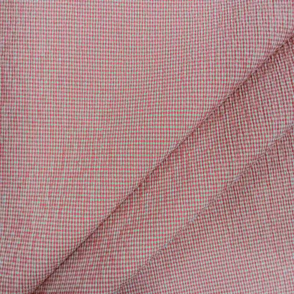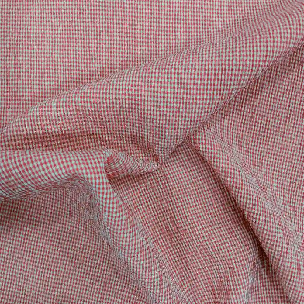 Tela seersucker vichy pequeño en color teja, ligera y transpirable. Ideal para prendas de verano y confección infantil.